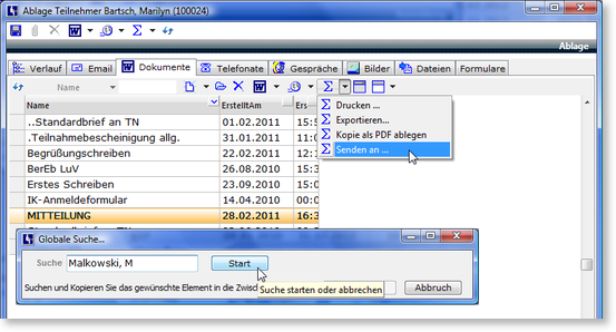 2. Sie wählen das Dokument in der Ablage des Teilnehmers, klicken auf „Senden an …“, geben wesentliche Teile des Arbeitsberaternamens ein und klicken auf Start: