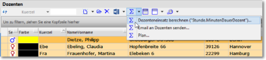 Um hier den tatsächlichen Stundeneinsatz des Dozenten ermitteln zu können und die gekoppelten Stunden nicht etwa doppelt zu zählen, raten wir, zuvor bei den betreffenden Dozenten die Funktion <Dozenteneinsatz berechnen> auszuführen.