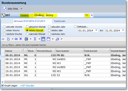 Möchte man nun wissen, wie viel er im angegebenen Zeitraum unterrichtet hat, so sieht ABES/Objects eine vorbereitete Filtermöglichkeit vor: