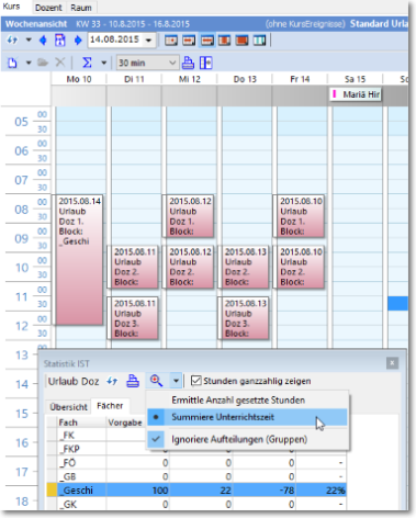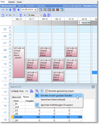 D.h. jeder Unterrichtsblock zählt soviel Stunden, wie Sie im Zeitraster definiert hatten (hier: Neun Blöcke à zwei Std. = 18 UStd.) - egal wie lang oder kurz der einzelne Block auch sein mag.