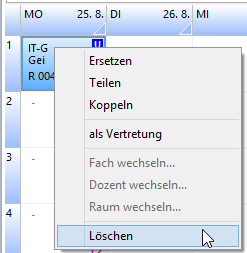 In der Detailansicht kann die Laufzeit der Stunde verändert oder spezielle Notizen erfasst werden. Besonders wichtig wird die Detailansicht, wenn Teilungen oder "Geplante Kollisionen" (früher: Koppelungen) existieren oder Vertretungen geplant wurden, da sich diese Informationen nicht komplett im Stundenraster darstellen lassen. Wenn die Strg-Taste gedrückt wird, können Sie die Maus über das Stundenraster bewegen während gleichzeitig die Detailansicht aktualisiert wird.