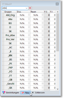Sie klicken unten "Filter" an, oben im Planassistenten erscheint ein Eingabefeld, in das Sie Buchstabenfolgen des gewünschten Fachnamenkürzels (Spalte: Gruppe) schreiben. Dann drücken Sie ENTER. Das Filterergenis erscheint. Wollen Sie wieder alle Fächer sehen, klicken Sie bitte noch einmal auf "Filter".