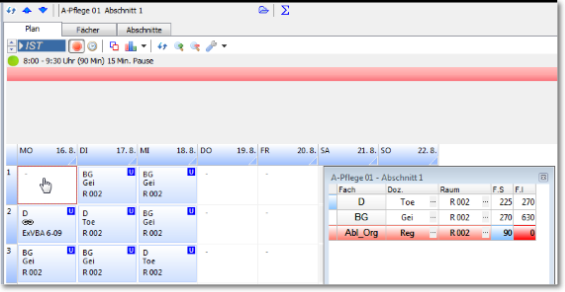 . Damit öffnet sich der Planassistent, der Ihnen nun die zugewiesenen Fächer, die schon zugewiesenen Dozenten und in der Spalte F.S (Fachstunden Soll) die festgelegten Wochenstunden (in Minuten) anzeigt.
