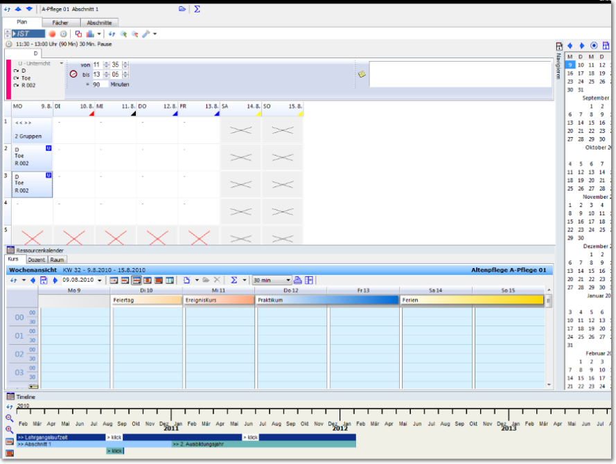 Durch farbige Ecken im Spaltenkopf des jeweiligen Tages werden Sie auf Eintragungen im Betriebs- oder Kurskalender hingewiesen. Eine roter Winkel bedeutet Feiertag, ein blauer Praktikum und ein gelber Ferien. Schwarze Winkel stehen für allgemeine Ereignisse. Beim Setzen von Stunden werden später in den jeweiligen Blöcken zusätzliche Hinweise angezeigt. Über den Ressourcenkalender unterhalb des Stundenrasters lässt sich der Kurskalender einblenden. Hier können Details zu den KursEreignissen und -Abschnitten eingesehen und diese auch bearbeitet werden.