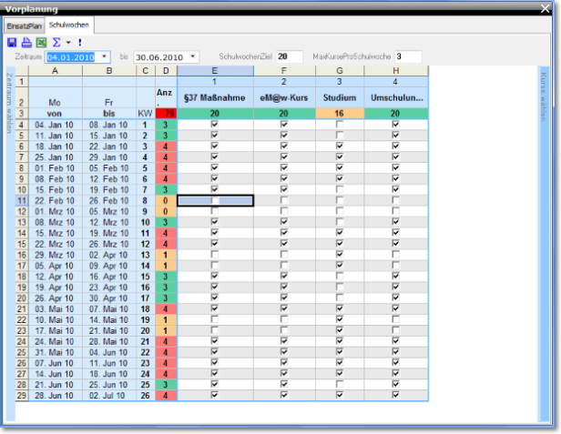 Eine Vorplanung in ABES/Objects machen Sie dann, wenn Sie in einem Zuge viele sich überschneidende Kurse planen müssen und Sie die Möglichkeit haben, eine Verzahnung von Unterrichts- und Freizeiten so zu gestalten, dass die Terminierung der Kurse in Bezug auf ressourcenschonenden Umgang mit Räumen oder Dozenten wünschenswert ist. Gucken Sie dazu bitte folgendes Video:
