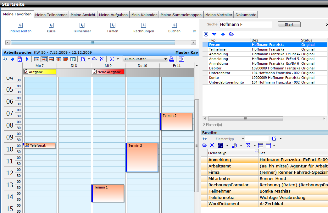 Meine Aufgaben> präsentiert Ihnen Unerledigtes in einer tabellarischen Zusammenstellung. Sie erstellen Sie mit Rechtsklick der Maus aus Ihrem Kalender heraus. Beim Anfertigen einer Aufgabe ist es möglich, die Aufgabe einem anderen Anwender zuzueignen, der darüber per Mail automatisch benachrichtigt werden kann. Die Aufgabe erscheint dann bei Adressat in Kalender und Tabelle.