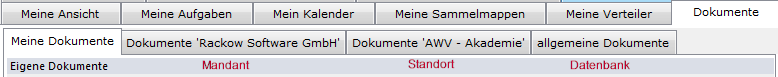 Meine Dokumente> ist eine Sammlung von Dokumenten, die Sie zweckmäßigerweise in ABES/Objekts gespeichert haben, damit Sie von überall her Zugriff darauf nehmen können. Sie erhalten hierunter vier weitere Register mit unterschiedlichen Zugangshorizonten: