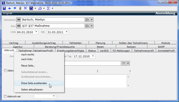 Auf diese Weise benötigen Sie nur eine Registerkarte für verschiedene Ausbildungsorte, Kurse, Teilnehmer etc. gleichzeitig.