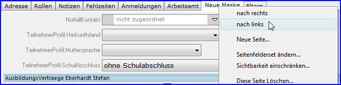 Im Feld <Name> können Sie die neue Seite benennen und damit die Beschriftung der Registerkarte festlegen. Nach dem Speichern steht diese für alle Anwender des Datenbestandes zur Verfügung. Durch einen rechten Mausklick auf den Reiter der Registerkarte kann die Position innerhalb der Registerkarten dieser Maske festgelegt, das Seitenfelderset verändert oder die Seite wieder komplett gelöscht werden.